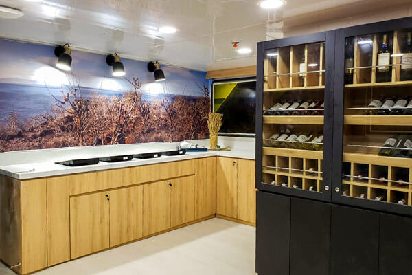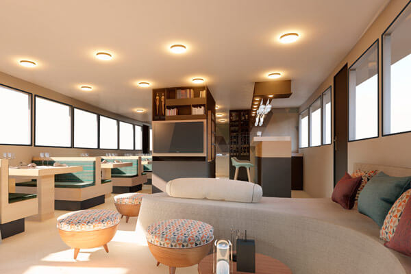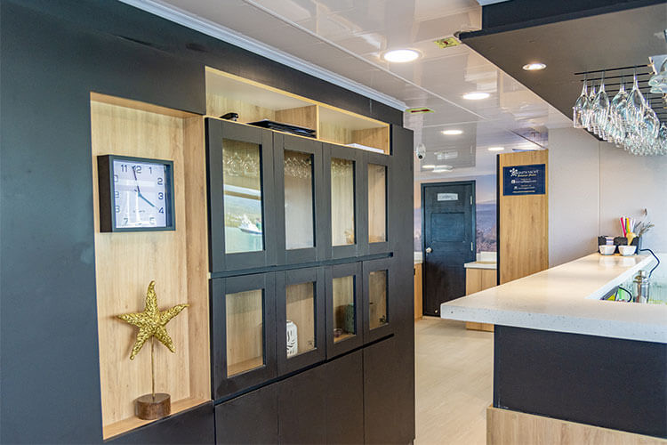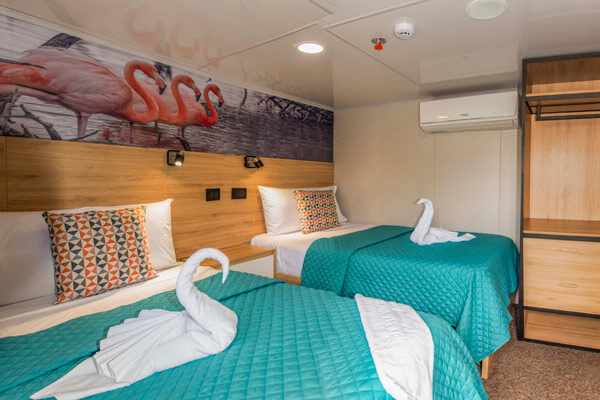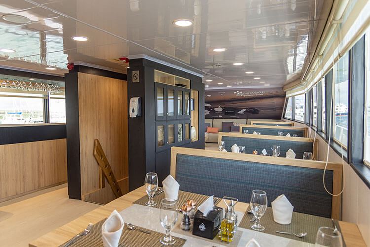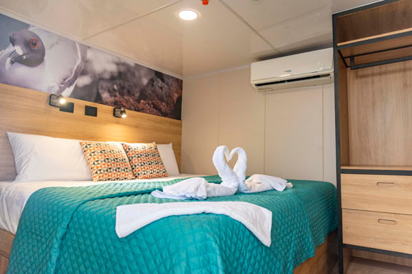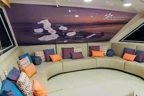 Built in 1991 and refurbished annually, this superior first-class, yacht accommodates 16 guests each and features three decks of spacious staterooms. Quarters include ten handsomely decorated double cabins; each is furnished with two twin beds or one double bed, a roomy closet and drawers, overhead storage, climate control, an intercom system, and a private bathroom. The boat also features spacious common areas which include a sundeck, dining room, well-stocked bar, conference area and library. The tours are lead by a biligual national guide. Bonita was also the first Hybrid boat to cruise the Galapagos with the installation of solar panels.