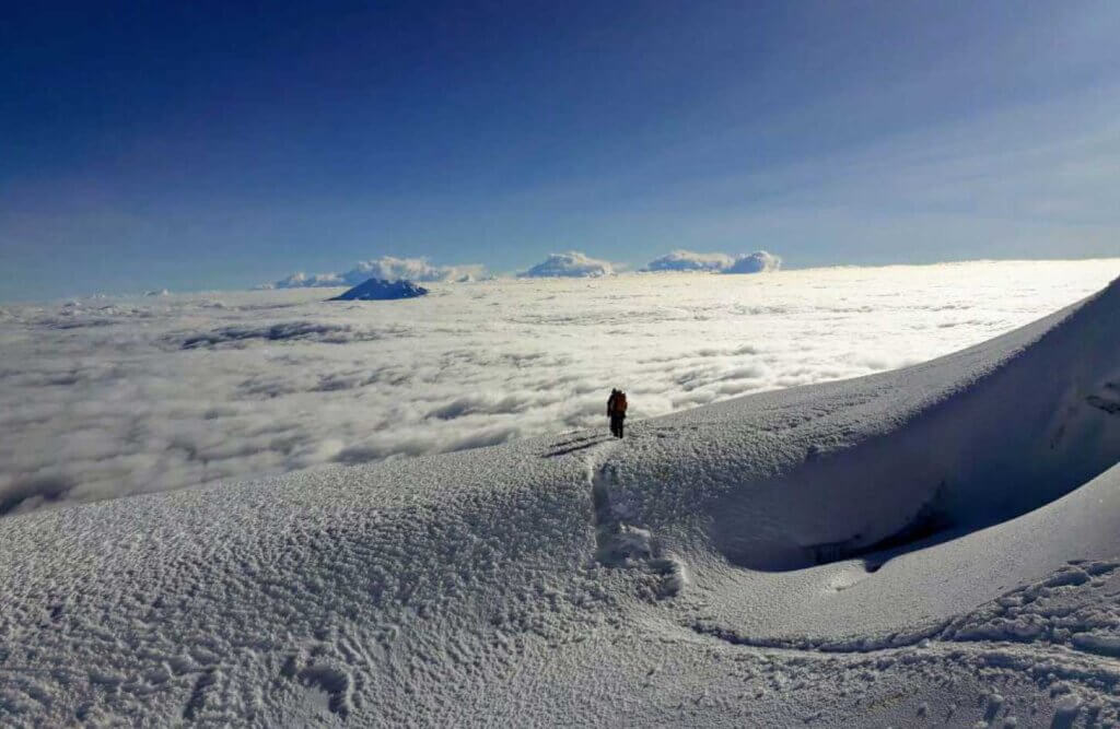 Around 1:00 am, we will start our climb to the Ecuadorian highest mountain, Chimborazo, which will take us around 8 hours. We will get to the summit (20,702ft/6.310m)in the early hours. The summit is a perfect spot for resting and to take pictures of the beautiful surroundings. Then we’ll start our descending to the High Camp, which will take us from 3 to 4 hours. Once in the High Camp, we will pack our belongings and then, we will still need to go down 2 hours to the parking lot, where our transportation will be ready to drive us down to Quito for overnight. END OF SERVICES