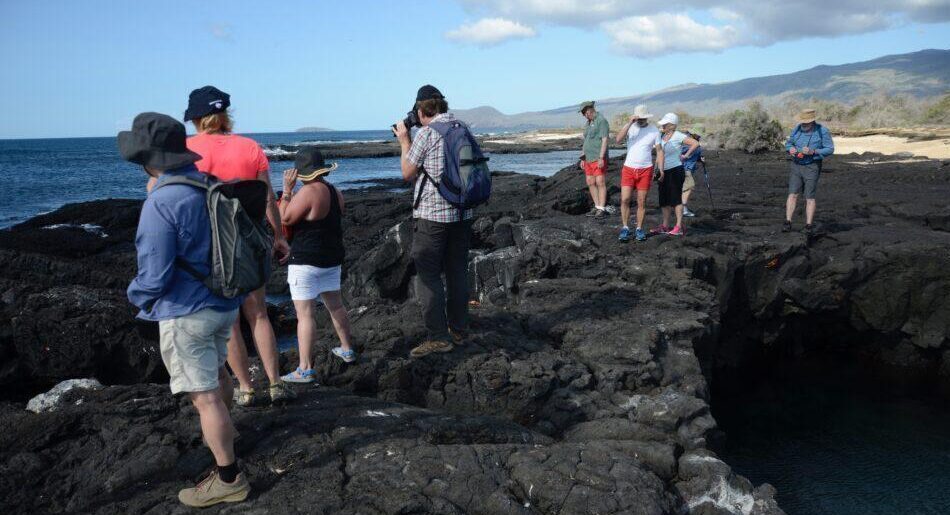 Cliffs covered by a small forest of giant cactus unique Santa Fe. Seabirds such as pelicans, lava gulls and blue-footed boobies fly over us. In our yacht, we will approach the beach and carefully observe tintoreras (white-tipped sharks) resting near the shore. In the mangroves, it is common to observe Galapagos hawks.